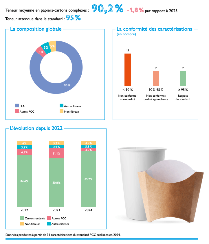 - Si dans la composition du flux la part des non fibreux continue sa décrue, -0,7% en 2024, en revanche les autres fibreux progressent de +2,4% et traduisent la difficulté en centres de tri de différencier PCC et PCNC.