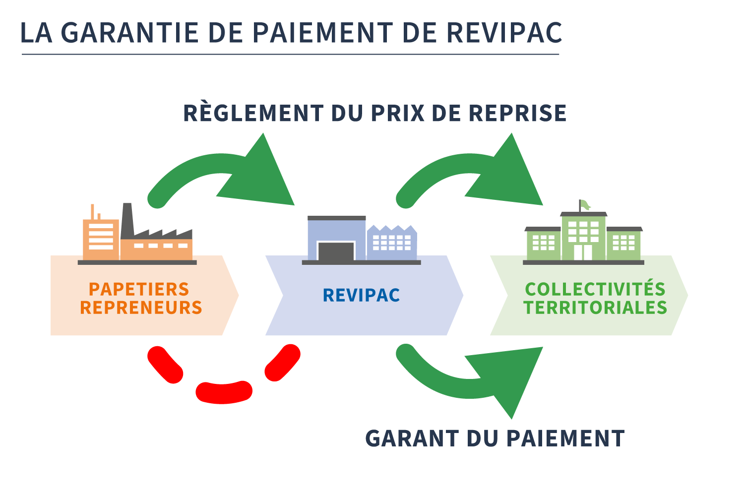Le règlement des sommes dues aux collectivités est effectué par les papetiers repreneurs, via REVIPAC et sous son contrôle. L’association en garantit le paiement en dernier recours et assure également la transmission des données et certificats permettant le versement des soutiens financiers par les éco-organismes.