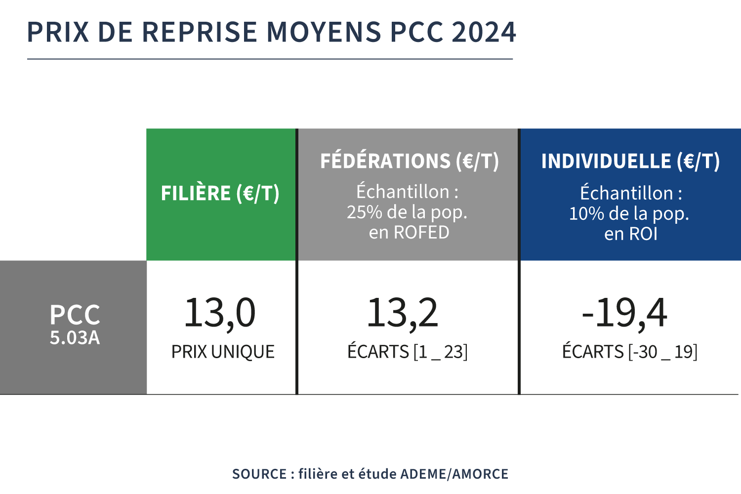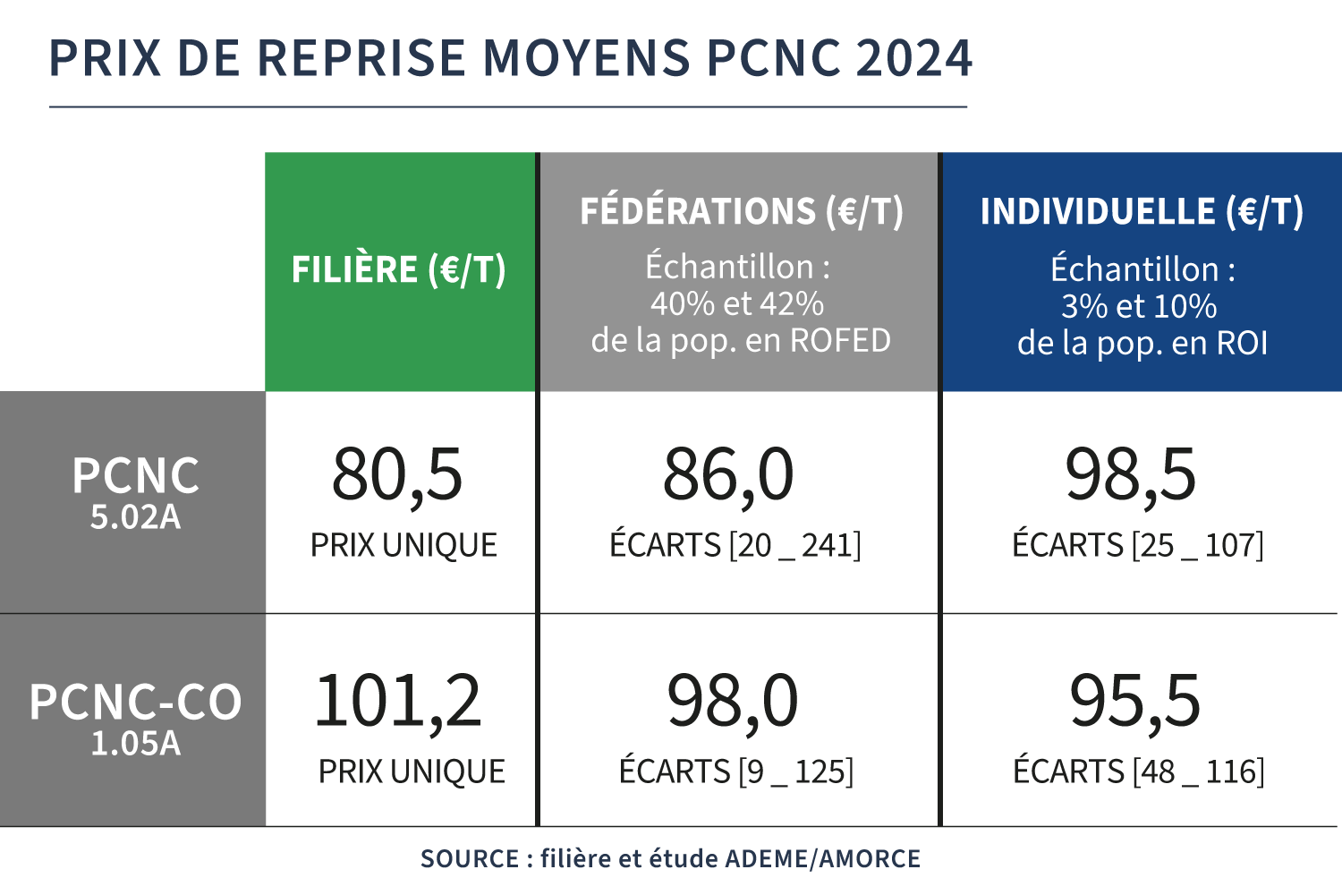 Les règles qui s’appliquent sont fermes, valables pour la durée de l’agrément et non révisables, sauf cas exceptionnel. Pour le standard PCNC, les prix sont établis pour chacune des sortes d’emballages récupérés le composant, 5.02A et 1.05A. Il s’agit de prix uniques applicables à l’ensemble des collectivités au sein de l’option filière. Le standard PCC qui ne fait pas l’objet de transactions suffisantes pour être côté, bénéficie d’un prix de reprise positif forfaitaire.